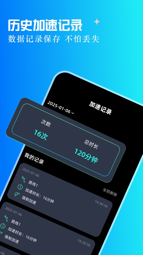 5、记录删除:所有记录的加速记录均可一键删除,帮助你释放更多手机空间,使用更加流畅;