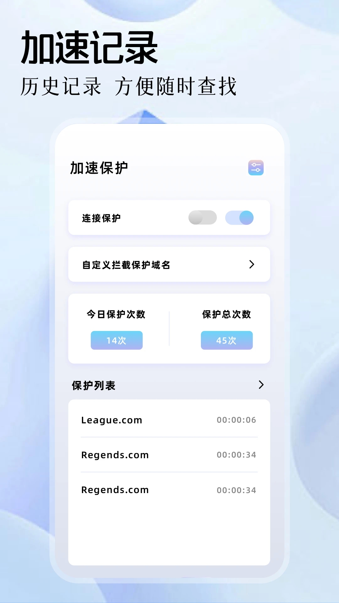 3、加速统计:自动记录并统计网络加速的次数和总时长,随时都能在应用中查看和分析;