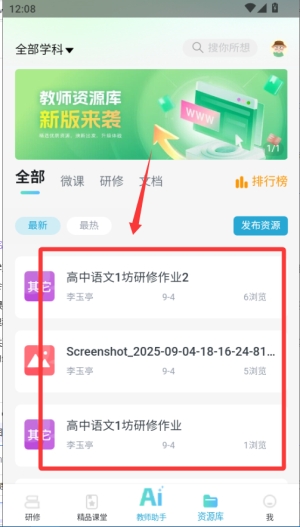 3、在资源库板块下载课件、习题等资料,加入研修小组后能与其他学员讨论,分享学习笔记或疑问,系统会推送相关优质资源。