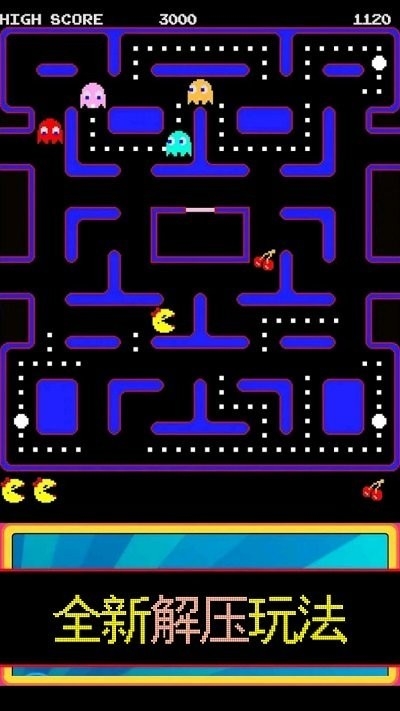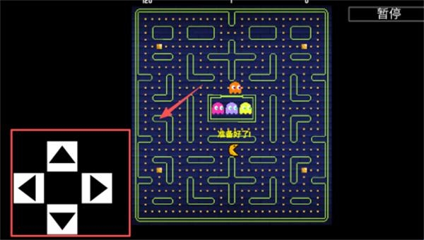2、迷宫场景采用经典吃豆人布局,通过左侧红色边框方向键控制黄色吃豆人移动轨迹,遇到紧急情况可点击右上角暂停键冻结游戏。