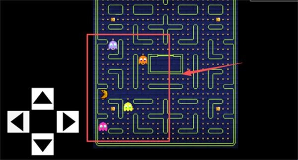3、在经典模式中需灵活运用左下角白色方向键操控角色,在吞噬豆子的同时要规避红色、蓝色幽灵的围追堵截。