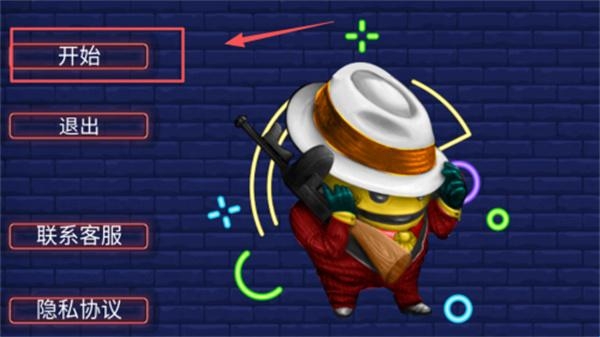 1、进入游戏主界面后,点击左侧红色箭头标注的"开始"按钮即可开启挑战,右侧设置菜单内含退出、客服咨询及隐私协议查看功能。