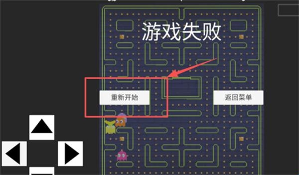 4、当被幽灵捕获后会出现结算界面,点击红色边框内的"重新开始"立即续关,右侧菜单按钮可退出当前迷宫选择其他关卡。
