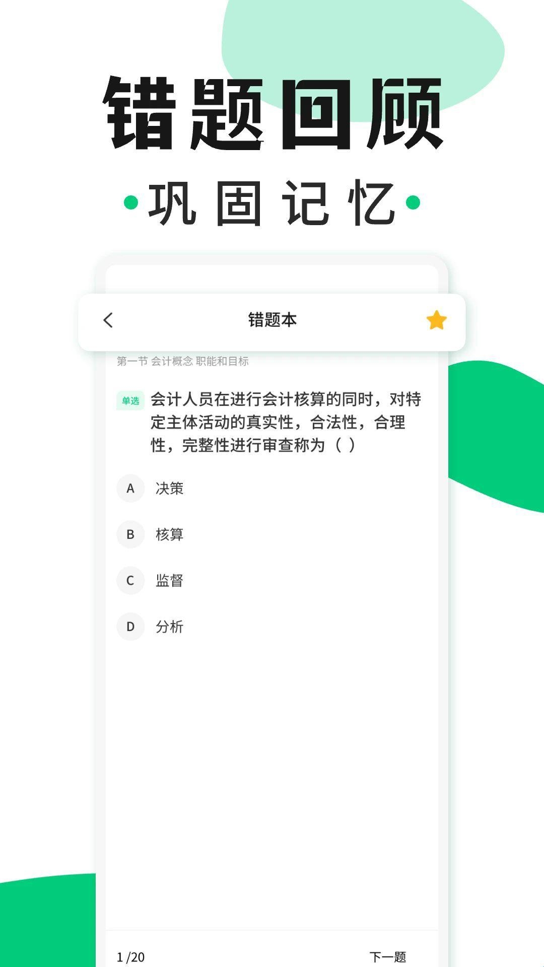 2、内置丰富章节练习,紧扣会计知识要点,每个章节都精心设置题目,循序渐进,帮你夯实基础,稳步提升专业素养。