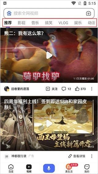 2、点击“视频”可以看到很多类型的影视和流行热门短视频,上方左右滑动可以调整分类;