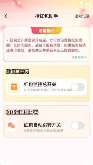 3、点击抢红包助手,打开红包监控总开关,即可以立即开启红包猎手智能提醒服务。