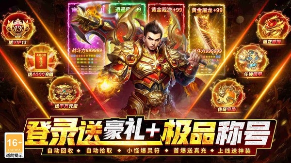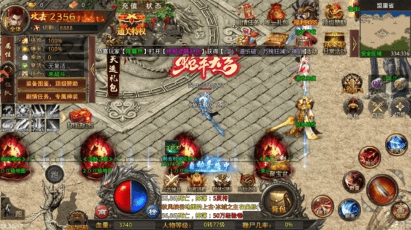 游戏支持万人同屏热血攻沙、跨服争霸等PVP玩法,玩家可前往皇城安全区向全服或跨服玩家发起挑战,获胜方可获得钻石;向土城安全区敌对行会发起挑战,获胜行会可获得特色奖励。