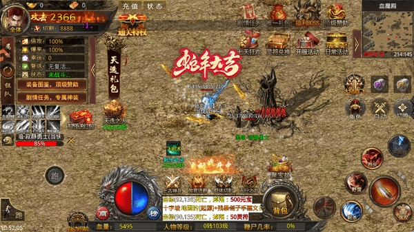 世界BOSS:每日定时刷新终极BOSS,掉落终极装备与生肖装备夺宝奇兵:通过击杀宝箱怪物获取神秘宝箱,保持5分钟不掉落可兑换灵符与充值卡通天塔:十层爬塔挑战,每层奖励灵符与生肖碎片,击杀指定数量玩家可晋级