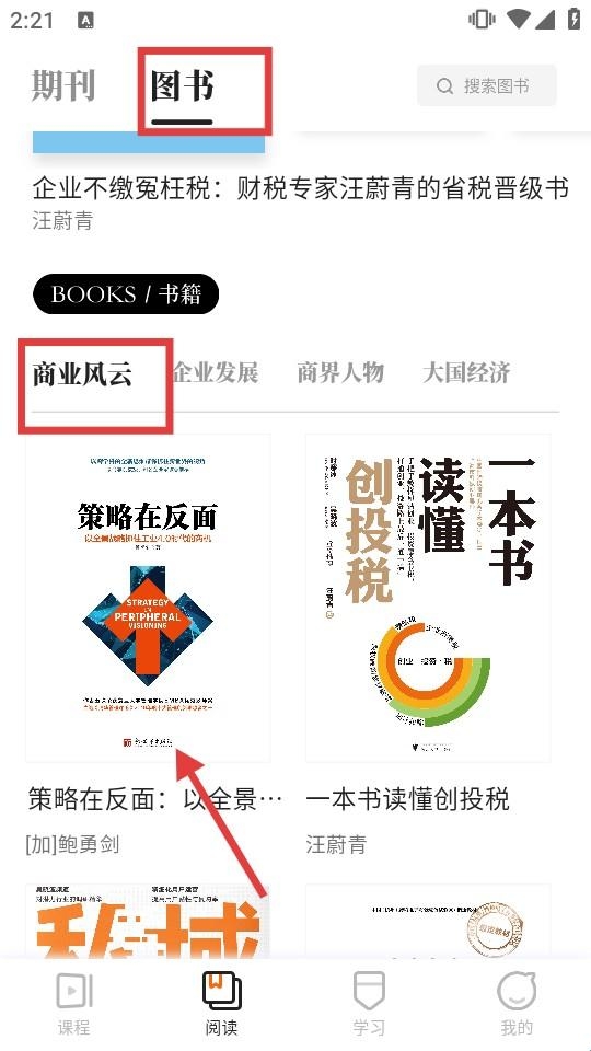 2、在阅读页选【图书-商业风云】分类,选择下方感兴趣的书籍,点击进入详情页。