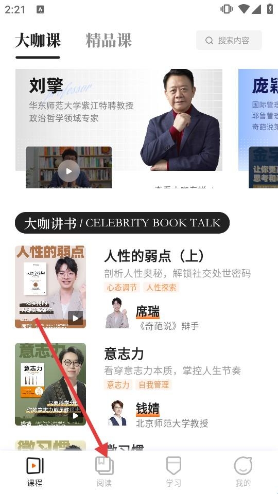 1、从【课程】页点【阅读】,进入阅读页可找书籍。
