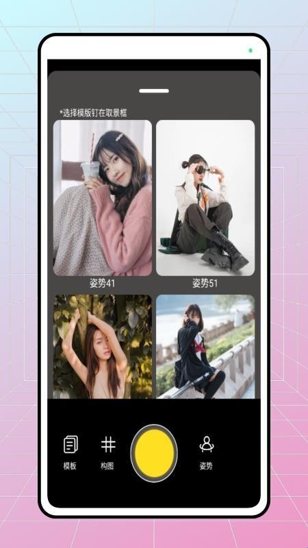 4、姿势模版:能够对拍照姿势模版进行选择,就可让你一键拍同款,更好的拍摄同款姿势的照片。