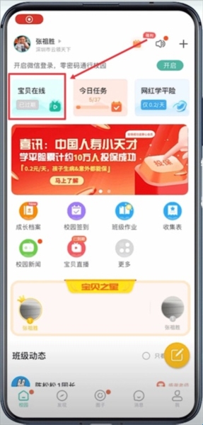 1、首先在我们打开app后选中左下角“校园”再点击左上角“宝贝在线”