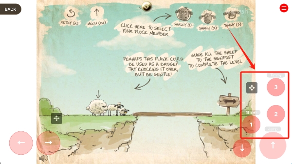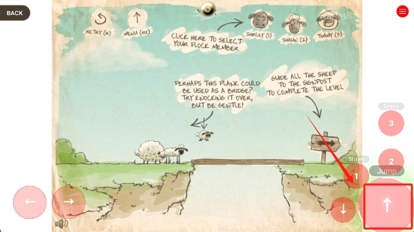 第1关:中羊推着小羊走到木头旁边,推几下,刚好能让木板横在悬崖上成为独木桥,三只羊过桥即可。