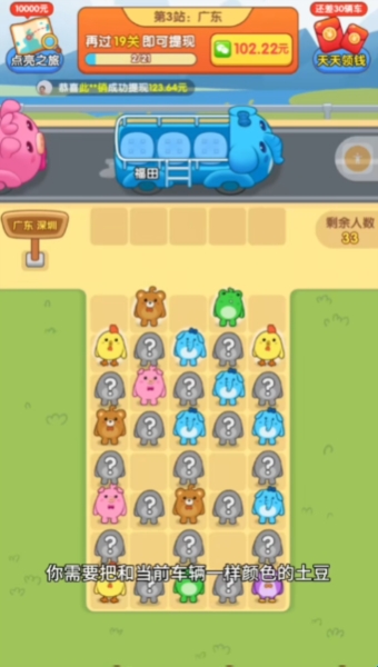 1、简单易玩的休闲益智游戏,游戏的主角是可爱的小土豆。他们需要快速上车,避开各种障碍,收集满满的红包。