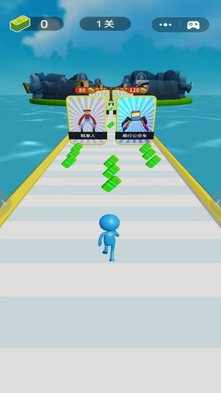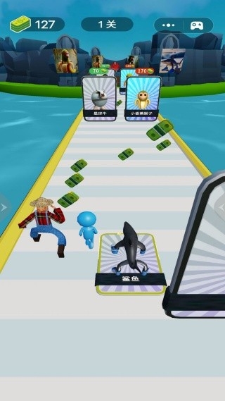 1、通过左右滑动控制角色横向移动,上划手势触发跳跃动作,灵活走位躲避陷阱并收集绿钞。