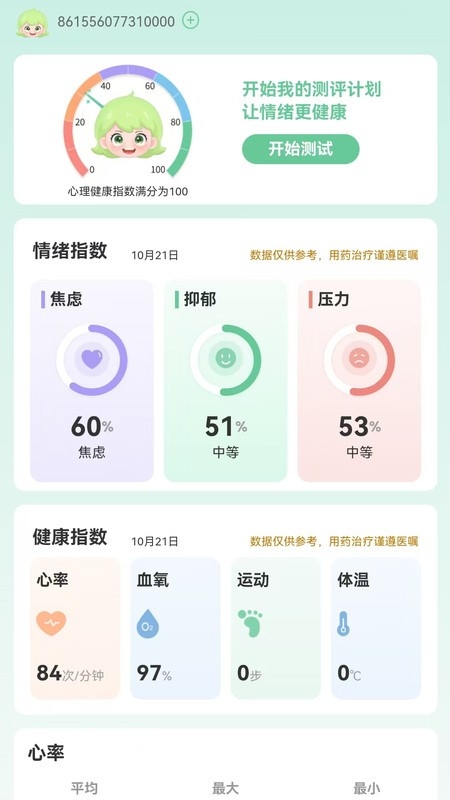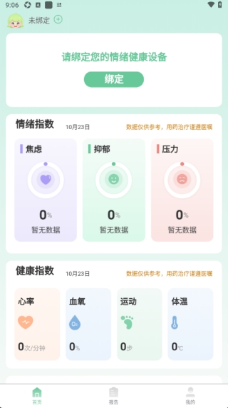 3、这样就能进入到首页,可以先绑定您的健康设备,还能提供情绪指数和健康指数服务。
