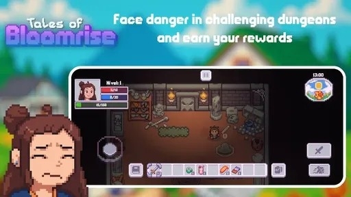 花绽物语,一款采用了像素画风设计的rpg角色扮演手游,你将和游戏内的角色们一起经历各种趣味玩法,从日常到战斗,非常有意思!在这里,你可以自由建设房屋,与NPC们互动,有时候会触发一些特定剧情,喜欢的玩家千万不要错过哦!
