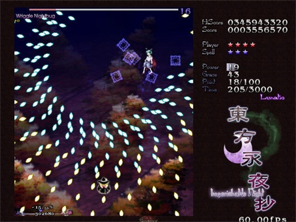 7、然后就进入游戏了,Z是发射子弹,X是BOMB,还有SHIFT键(按住),是切换人物,按住SHIFT键后一般移动速度都会慢一些,另外就是在你的机体中心出现一个白点,此点为判定点,此点不被命中时,你不会有事。