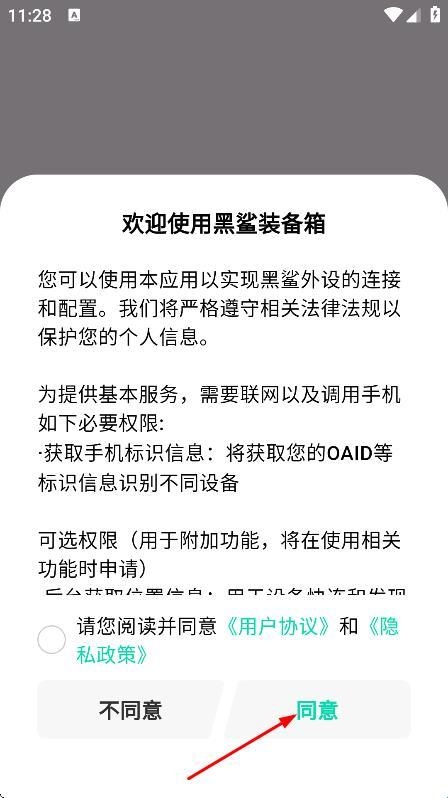 1、在黑鲨装备箱欢迎页面,点击同意,进入应用主页面。