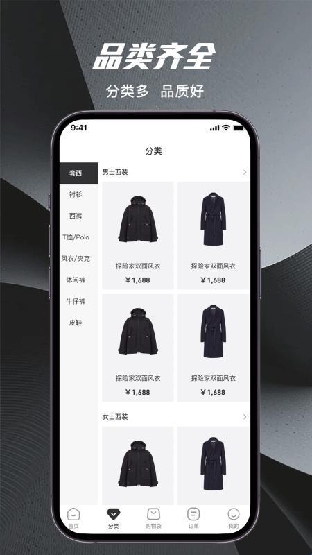 2、服装分类:可以根据不同的服装分类进行查找,快捷找到自己喜欢的服装类型,就可轻松选购服装。
