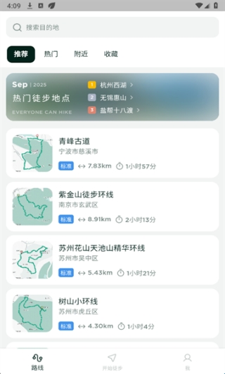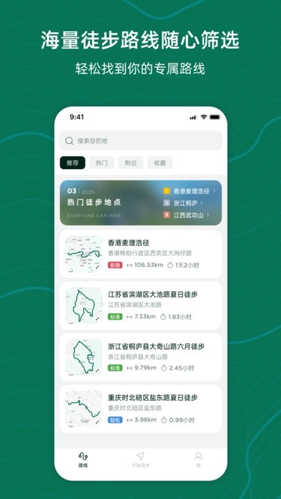 2、徒步路线:还可查看自己附近的热门徒步路线,轻松筛选自己的专属路线,快捷查找合适的路线。