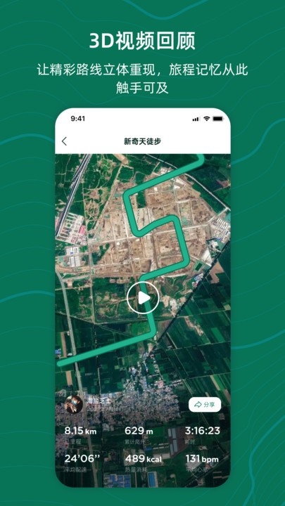 6、视频回顾:还提供了线上的3D视频回顾,对自己精彩的户外徒步路线可以实时重现,更好的回顾旅程记忆。