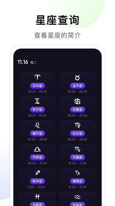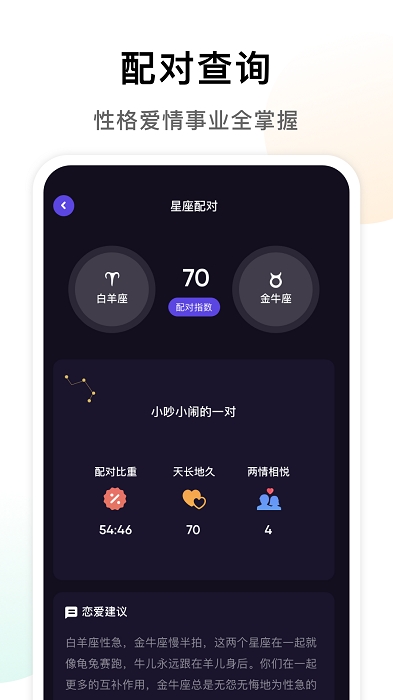 2、 **星座配对**:根据星座特性和相互关系,提供个性化的星座配对建议,帮助用户在生活、爱情和社交中找到最佳伴侣。