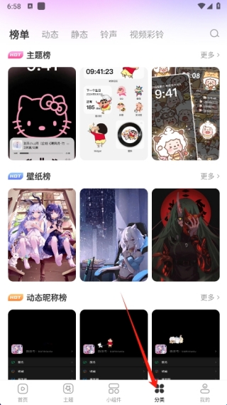 4、分类栏目集中展示主题、壁纸、铃声的实时热度排行榜单。
