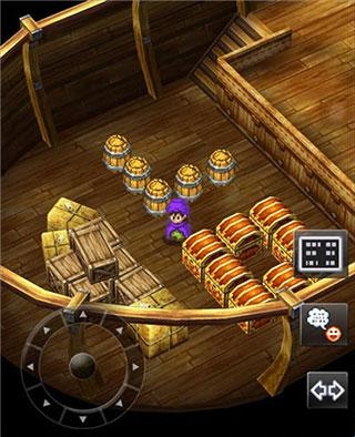 走出房间我们发现,原来我们是在一艘船上,这里需要我们调整一下视角才可以看到船帆后面的木桶,经常玩RPG游戏的玩家应该都和小编一样有个习惯,那就是每到一个场景都要把各个地方都搜刮一遍,玩勇者斗恶龙5也不例外。在开始的房间和甲板上我们先把柜子、图书架以及这些木桶全都搜查一遍,可以获得一些道具和物品