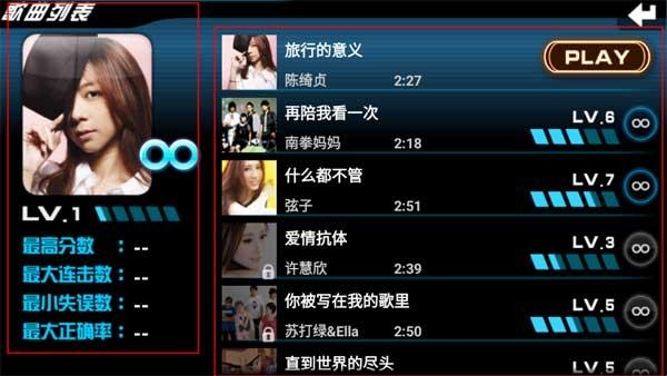 1、玩家打开游戏之后点击屏幕进入到主页面,下面小编开始介绍页面板块,左边现实的玩家的等级、最高分数、最大连击数、最大正确率等,右边显示的是歌曲列表,目前玩家只能玩第一个,等后期等级提升之后就能体验其他曲目了。
