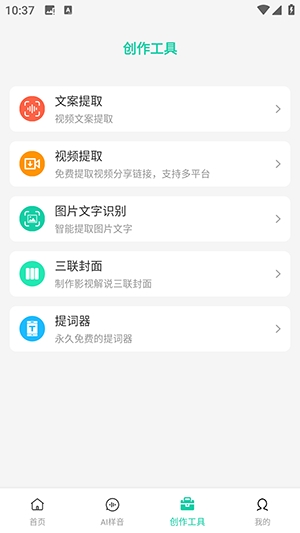AI配音,拥有多款情绪丰富的AI主播,配音作品提供免费多平台同步,可以随时随地,在不同平台完成配音; 文案提取,选择音频或视频文件,智能识别并提取文案内容,同时支持直接到处srt字幕文件; 视频提取,一键提取分享视频,支持导出至相册,不限次数; 悬浮提词器,永久免费,无广告,不限次数。