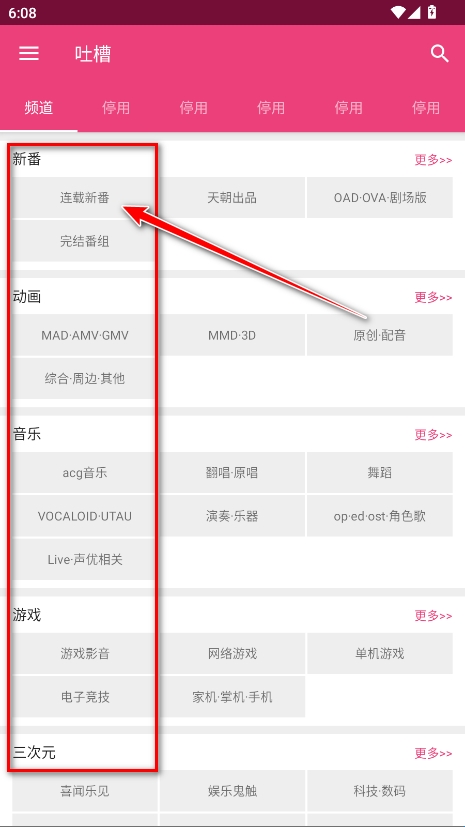 1、打开吐槽,可以看到主要有新番、动画、音乐、游戏等板块内容,每一个板块下面都会有小的分类,在这里小编以点击连载新番为例。