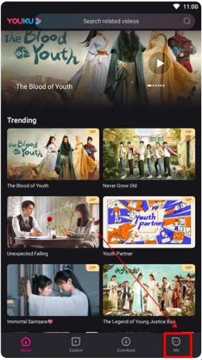 1、在本页面下载最新版国际版优酷app,点击进入主页,选择下方的【me】。