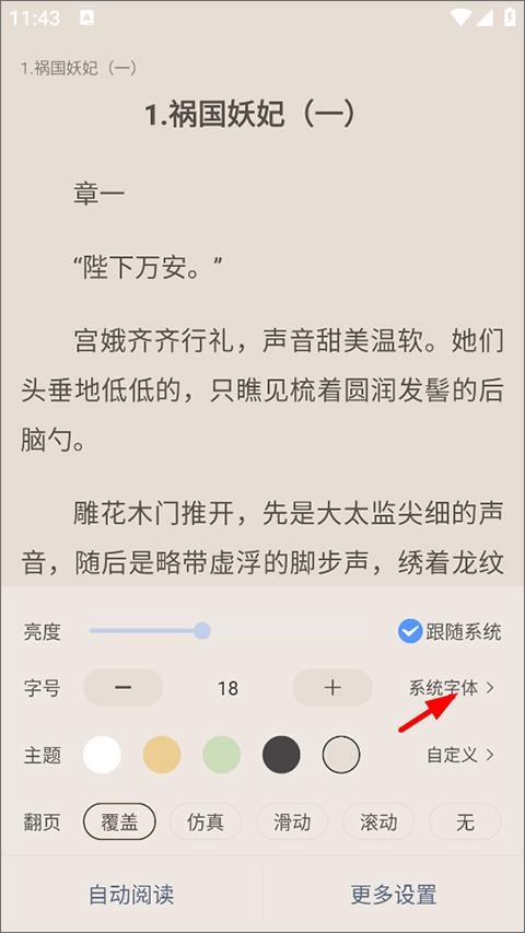 3、设置中打开阅读亮度、字号、主题以及翻页模式等,点击系统字体;