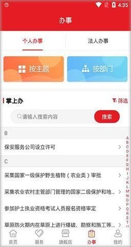 4、再次右划,进入办事界面,有个人办事,和法人办事;按主题、按部门等。