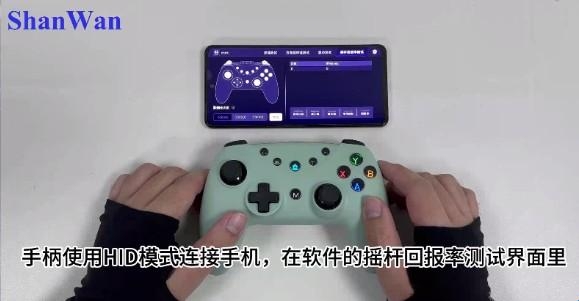 1、第一步,将手柄以HID模式连接至手机,并开启软件的摇杆回报率测试界面。