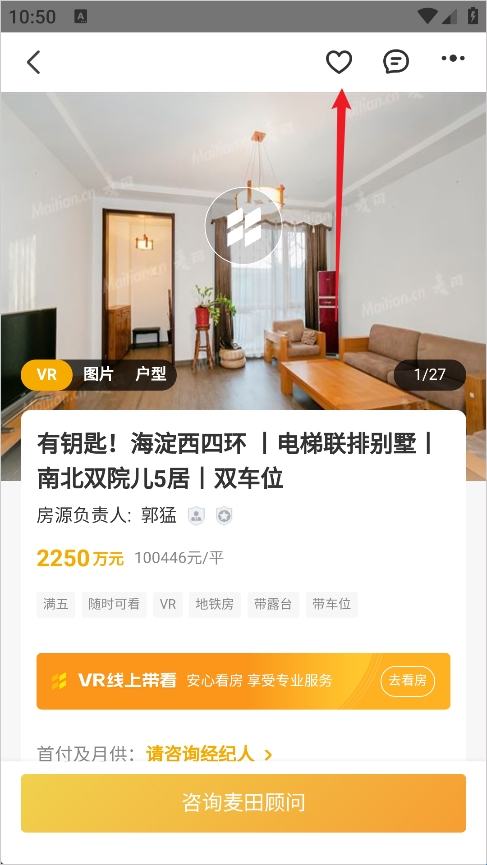 6、一键咨询:只需一键即可与麦田房产顾问沟通,不需要输入联系方式等信息,保护用户隐私。