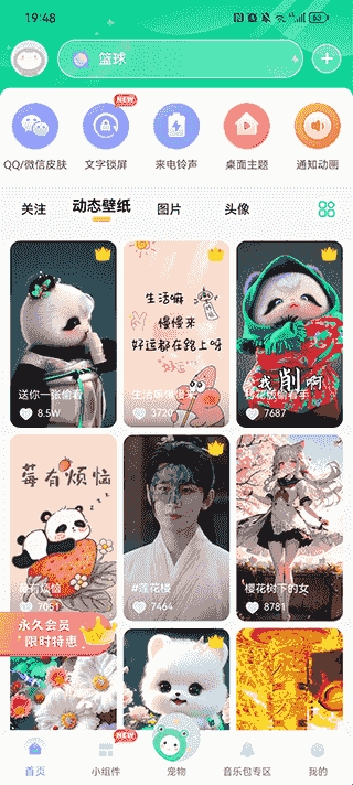 用户随后会进入首页,首页有非常多的壁纸可以进行设置,而且还有头像、QQ微信皮肤主题等可以设置。