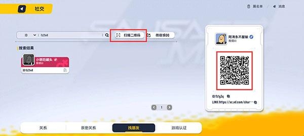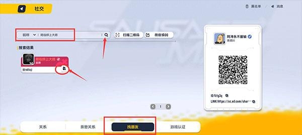 2、进入社交后在底栏选择找朋友,然后在搜索框输入id或者昵称点击搜索即可找到好友然后点击名片右小角的按钮进行添加