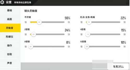 不开镜的情况下调整到56%,使用红点、全息、机瞄调整到22%,使用2倍镜调整到24%,使用4倍镜调整到15%,使用8倍镜调整到8%,使用15倍镜调整到10%。
