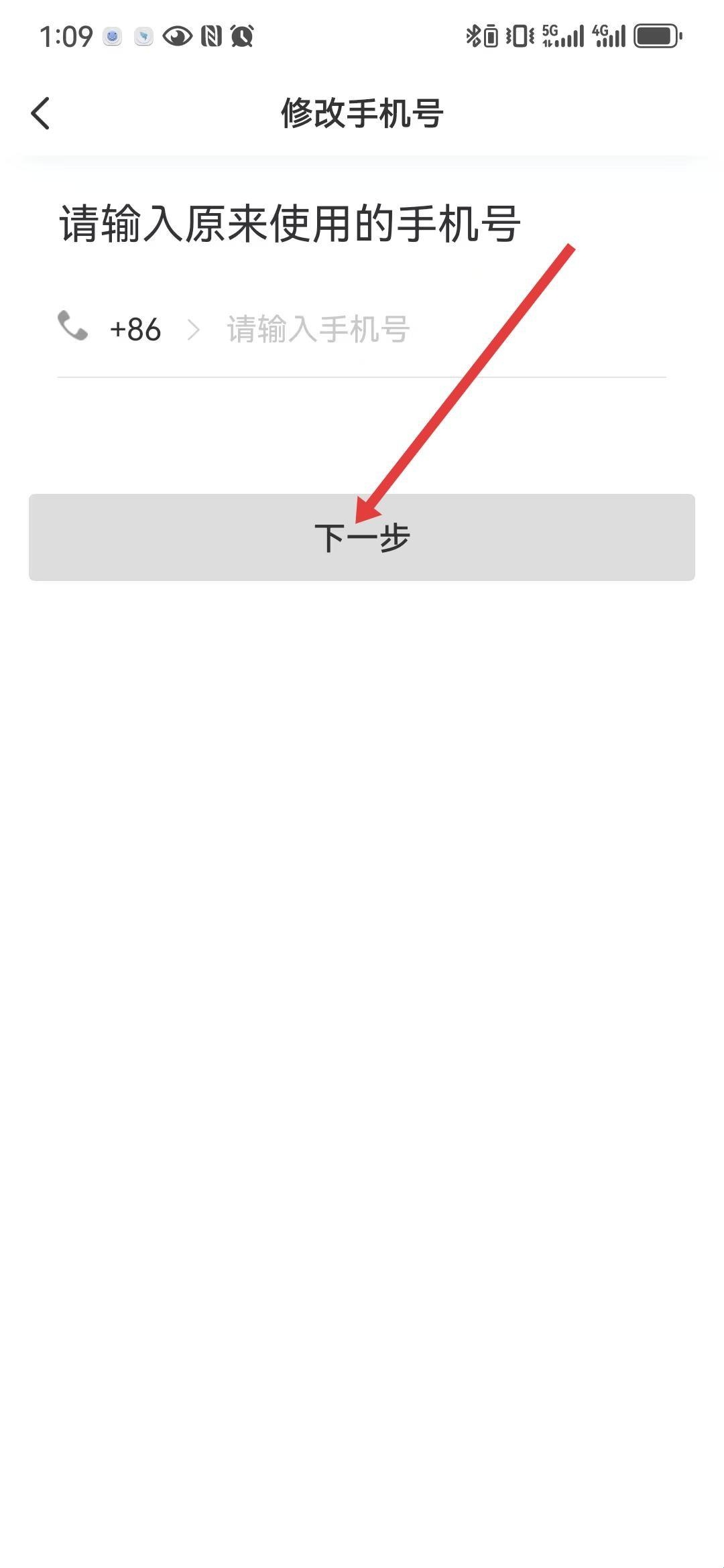 3、修改手机号功能界面,需用户先输入原手机号,点击下一步按钮即可开启手机号修改流程第一步,通过验证原号码身份,为后续更换绑定手机号提供基础操作入口。