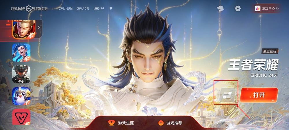 1、打开vivo游戏中心,点击右下角“我的”进入“游戏空间”,选择要更换背景皮肤的游戏,再点击“打开”旁的按钮;