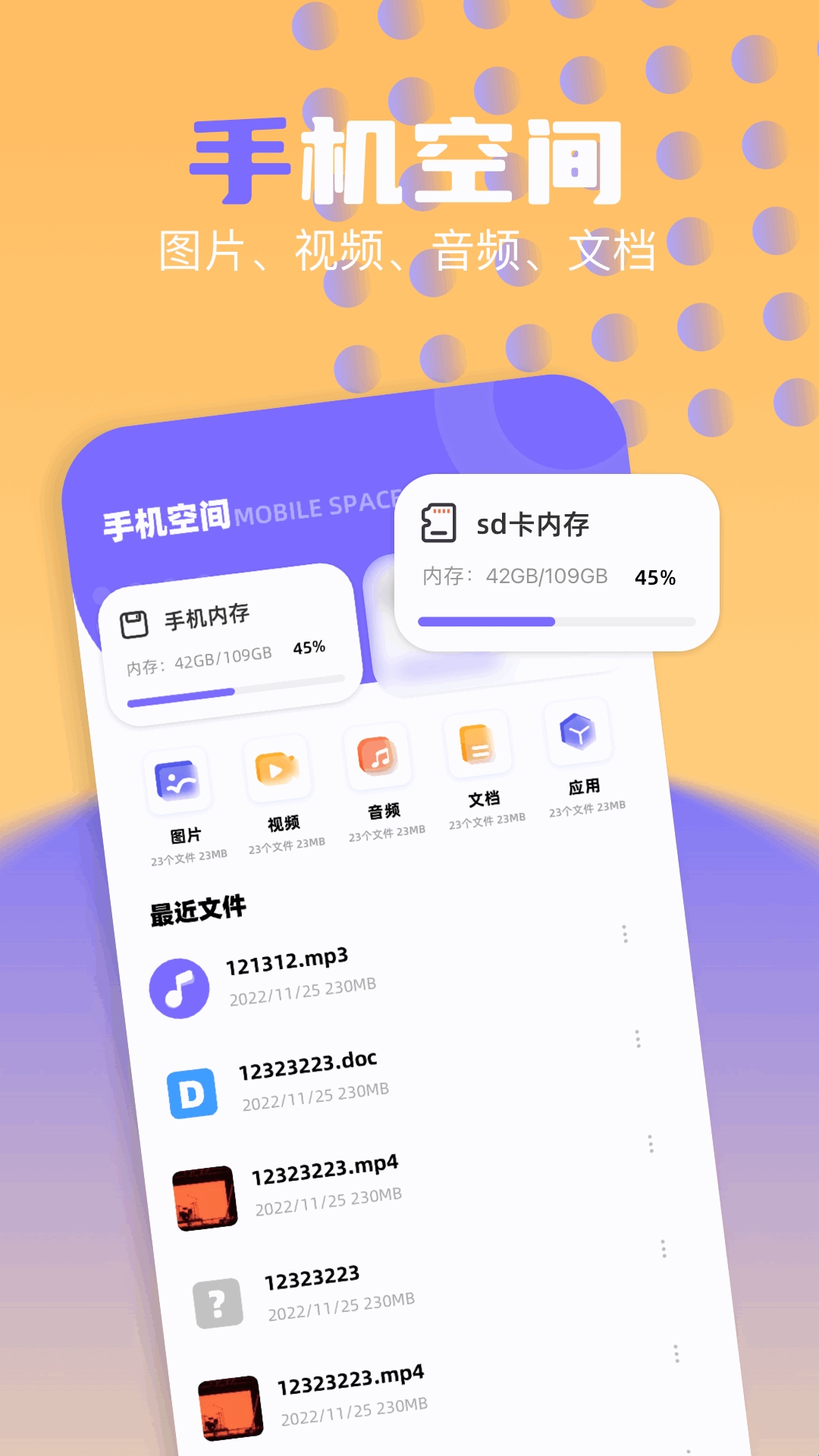6、文件管理:将所有的文件分类管理,分为图片、视频、文档、音频、应用等多种类型管理文件。