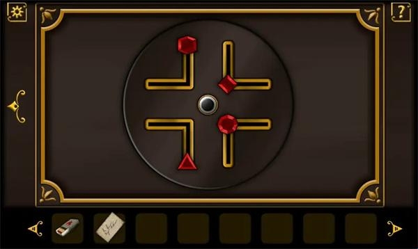 5、来到走廊地图旁的谜题前,上面正是fate所代表的几个图形。利用纸条的提示,可以解开这个谜题。点击中央圆钮旋转圆盘,把每个图形放置到正确的位置便可以了。得到钥匙。