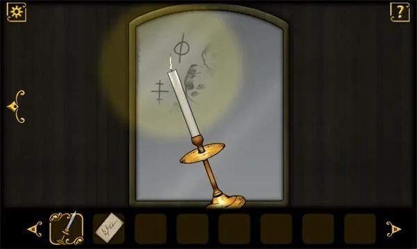 2、往里深入,看到墙上的地图和小圆几上的蜡烛台。旁边墙上有个谜题。继续往里,进入左边门中,梳妆台的镜子上夹着一张纸片,上面写着:光明总能揭露真相。用钥匙打开梳妆台的柜门,按下右面红色按钮,会发现变换的字母和与之相对应的图形。屋中右边的柜子上似乎缺少了什么。