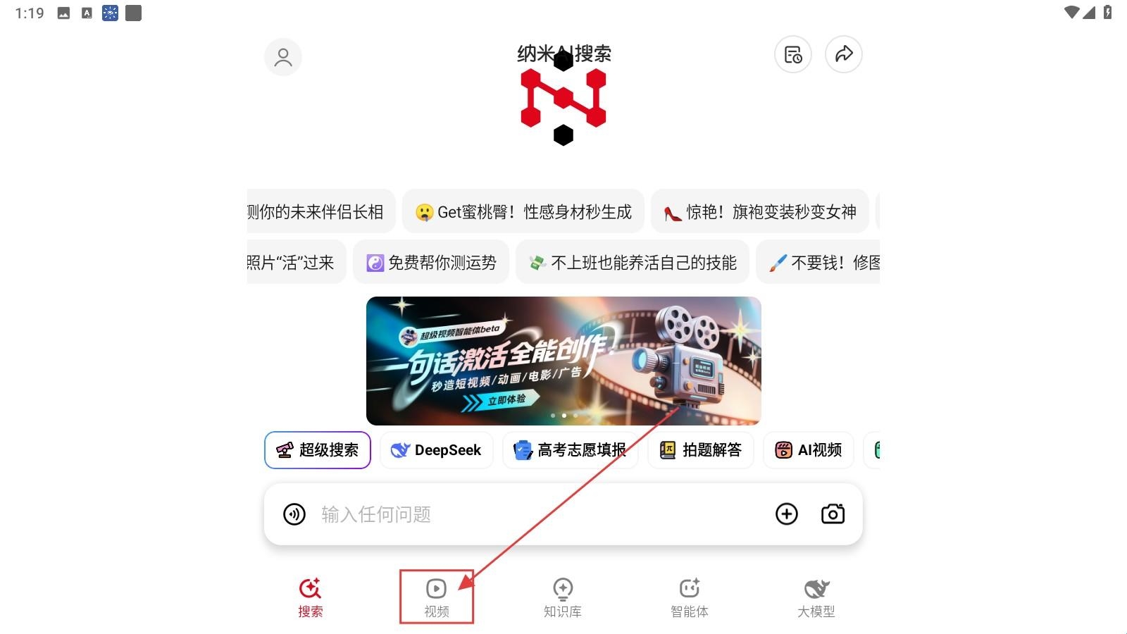 3、点击底部导航栏【视频】按钮,切换到视频功能界面,浏览各类视频相关创作与推荐内容。