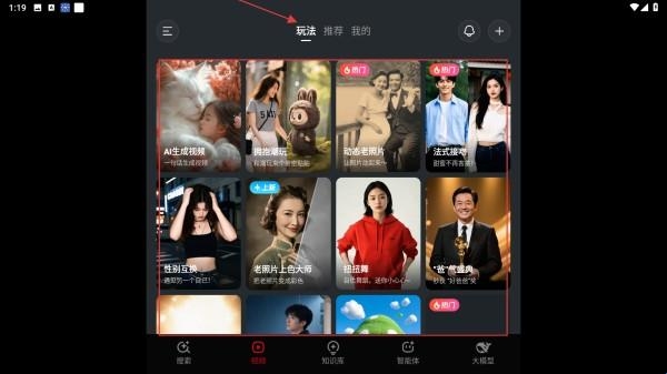 4、进入【视频】页的【玩法】栏目,选择如【动态老照片】等功能卡片,体验对应创作玩法。