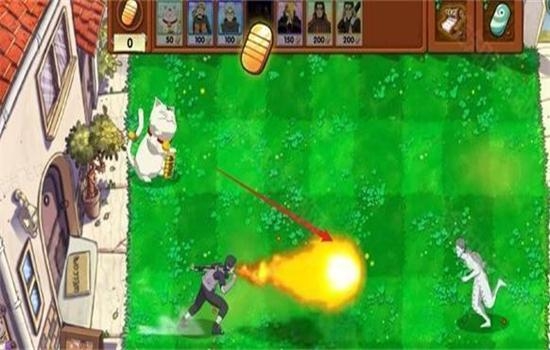 -向日葵(鸣人分身)产生阳光,豌豆射手(佐助千鸟)攻击僵尸,坚果墙(我爱罗砂盾)阻挡进攻。