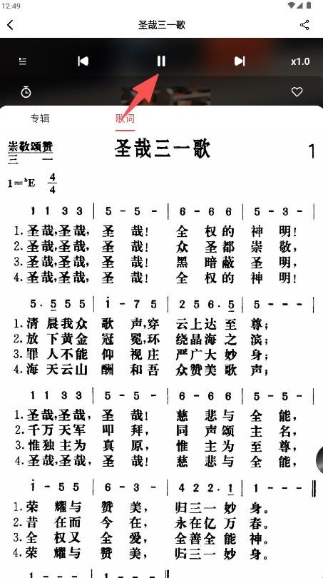 2、在赞美诗栏目中选择歌曲,例如“圣哉三一歌”。