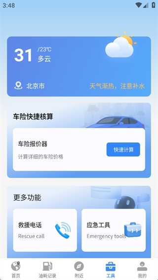 2、整合实用工具,天气预报功能可让用户提前了解天气,车险核算工具能帮助用户快速核算车险相关费用。